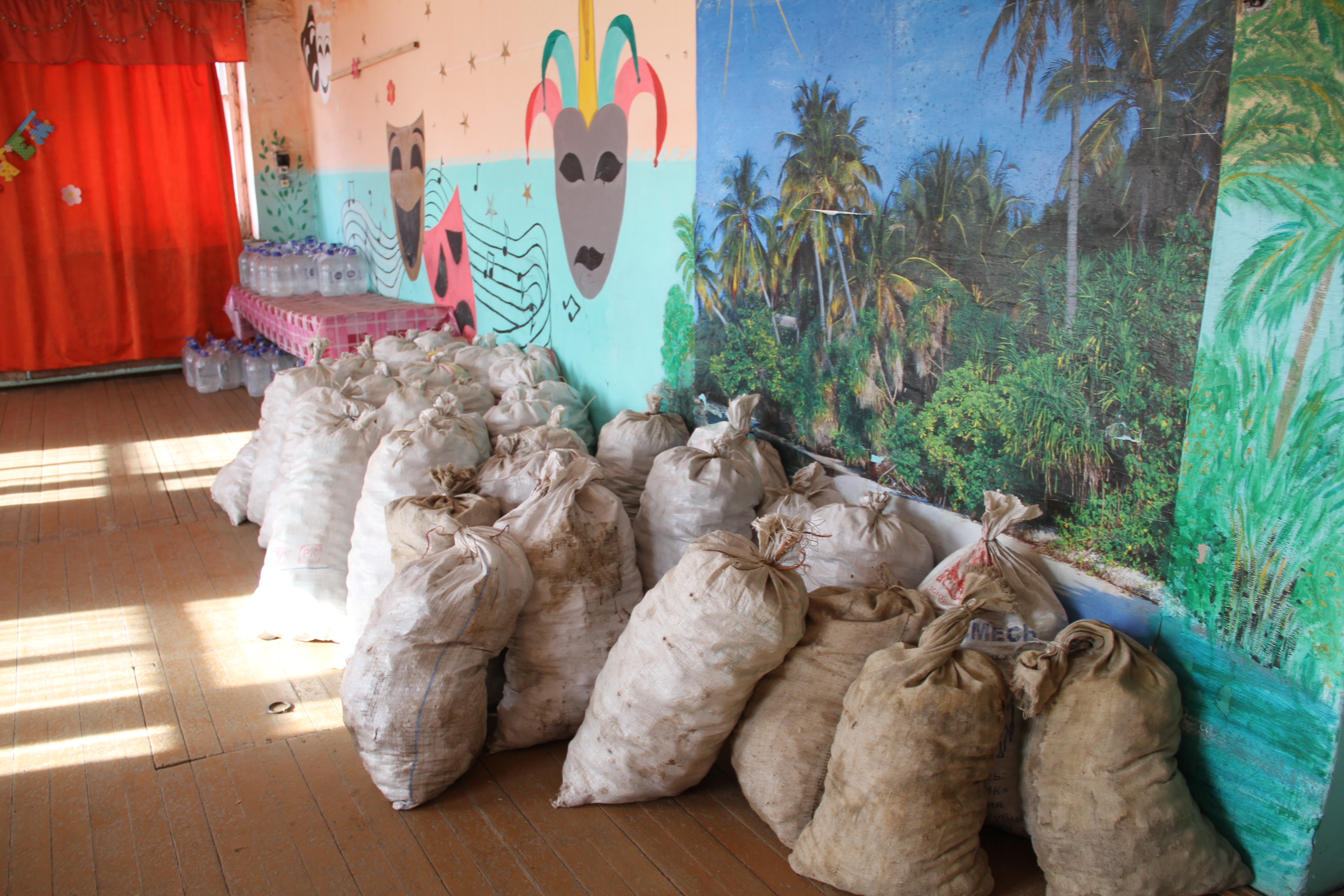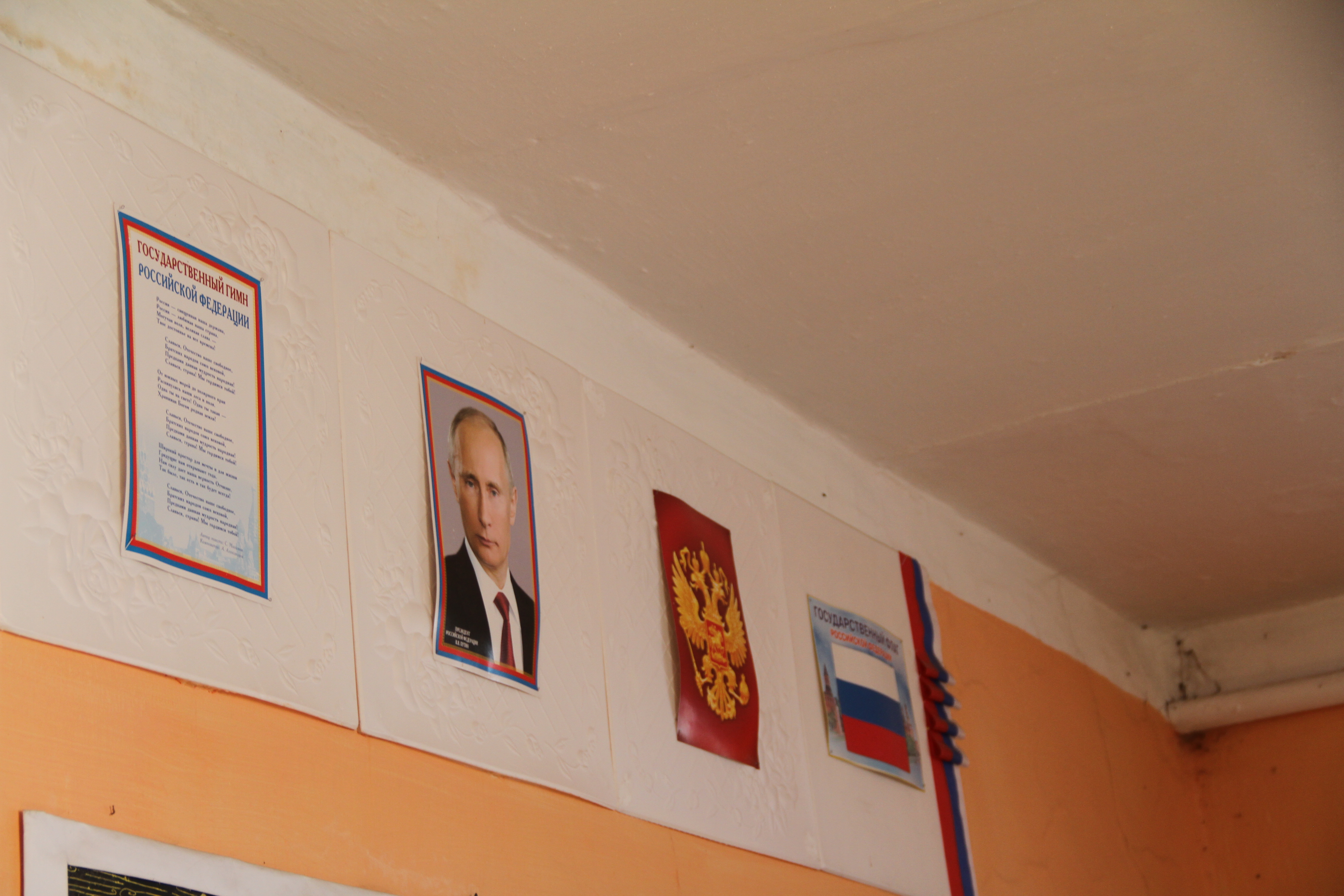 В коридоре выставлена батарея бутылок с водой, напротив – куча пакетов с вещами. Местные разбирают эти завалы – выбирают себе одежду. В полузаброшенном актовом зале опять разруха и гуманитарка – с десяток мешков картошки, вода. На обшарпанной стене – портрет Путина, текст гимна, фото флага и герб.