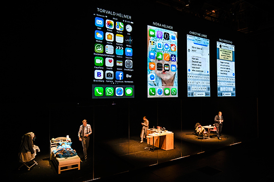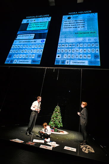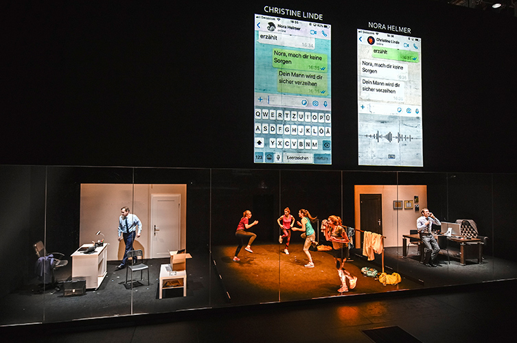 © Toni Suter / T + T Fotografie Сцена с попыткой предотвратить письмо Крогстада оказывается решена, на первый взгляд, совершенно кинематографическим методом: используя синхронность действия в трех застекленных пространствах, режиссер создает полноценный саспенс, и даже развязка эпизода, когда фру Линде вынуждает Нору к признанию, начинает выглядеть чуть ли не голливудским пуантом. Однако возможным такое решение оказывается именно благодаря сообщениям, которыми попарно обмениваются все участники сцены. И это уже не кинематографический, но специфически оперный (так хорошо знакомый Кулябину) принцип параллельного голосоведения: на экране, как и на сцене, даже двое одновременно говорящих персонажей создают неразборчивый гвалт, тогда как в опере одновременно могут петь хоть шестеро без ущерба для текста. Драматическая основа — киномонтажная драматургия — принцип оперного ансамбля: такую траекторию позволяет прочертить Кулябину перевод ибсеновского текста в формат WhatsApp.