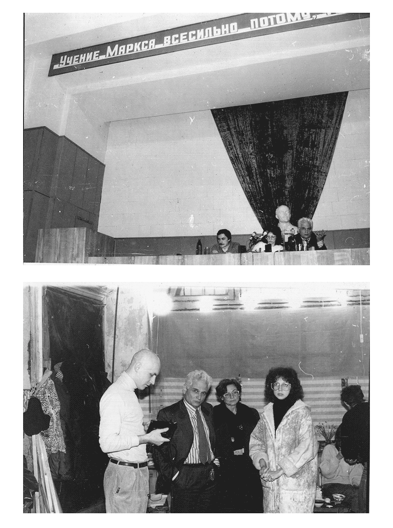 Сверху: Жак Деррида читает лекцию в Институте философии АН СССР. Снизу: Елена Петровская и Жак Деррида с женой в мастерской художника Юрия Петрука, март 1990 года