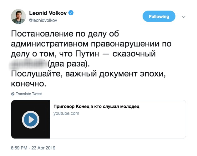 Согласно опубликованным документам, поводом для этого стал твит Волкова от 23 апреля. В нем он опубликовал видеозапись с оглашения решения по первому известному в России делу по статье о неуважении к власти и сопроводил ее своим комментарием.