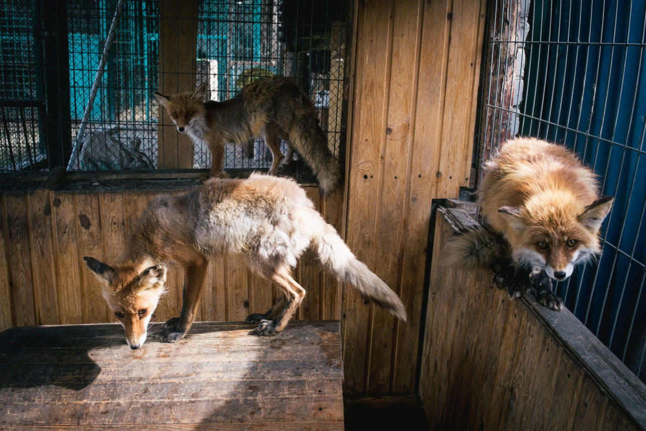 Через стенку с большими кошками расположились лисы. К примеру, Леня — жертва человеческой жестокости. Чтобы Леня не шалил и не занимал много места, владельцы контактного зоопарка с рождения держали его в круглом аквариуме. Лапы Лени упирались в выгнутые стенки и деформировались. Сегодня Леня — инвалид. Он не может бегать, качается на своих выгнутых лапах, как игрушка-неваляшка, все время ищет, на что опереться.