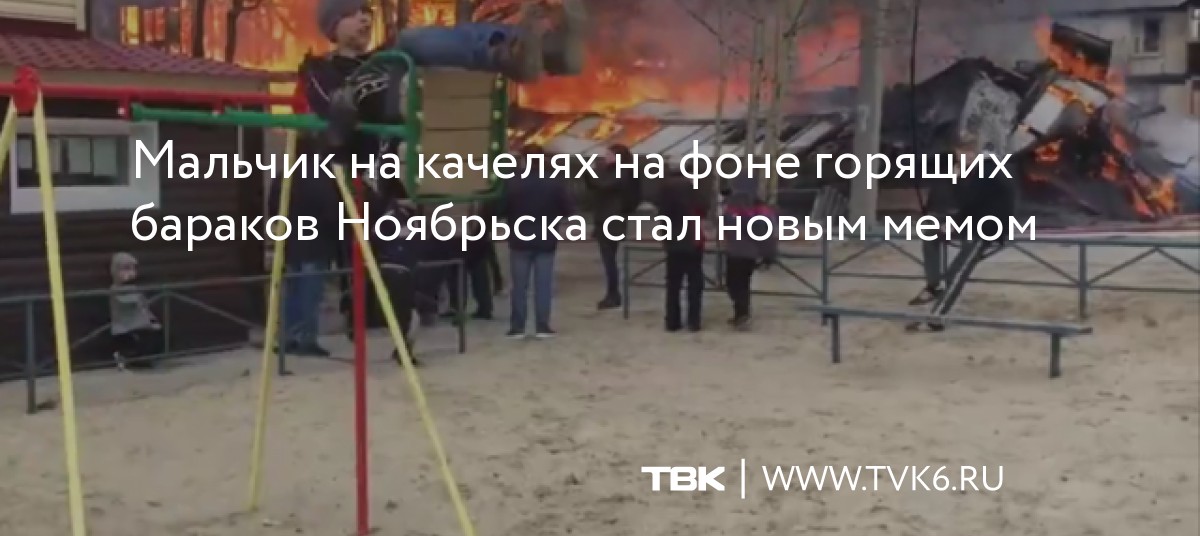 Мальчик, качающийся на качелях, на фоне горящего дома стал новым вирусным видео в рунете. Как сообщают местные СМИ г. Ноябрьска, видео снято 25 мая 2019 г., в этот день в Ноябрьске горел расселенный барак. Площадь пожара составила 570 кв. м. Автора видео установить не удалось.