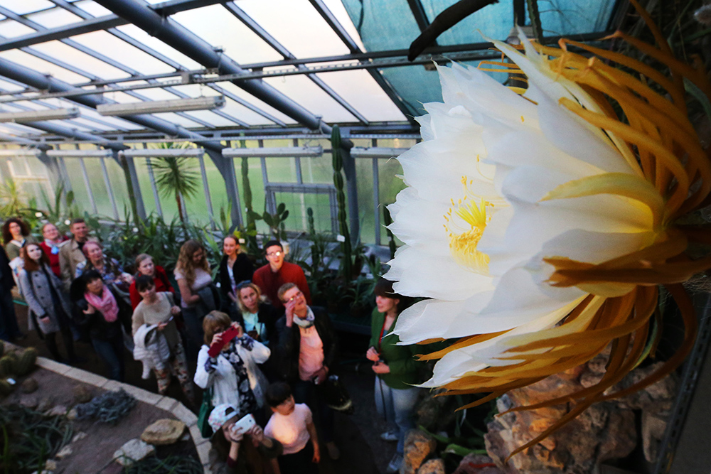 Каждый год в Ботаническом саду цветет кактус «Царица ночи» — его бутоны раскрываются всего на несколько часов. Посмотреть на это приходят сотни петербуржцев, ради этого Ботанический сад продлевает работу до позднего вечера.