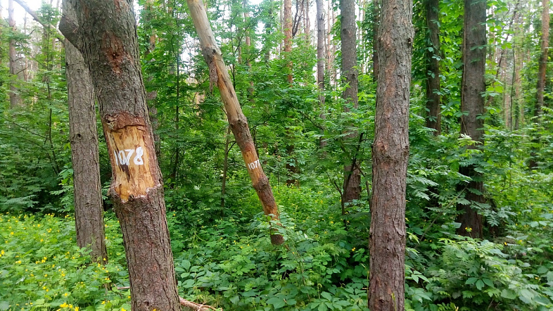 Еще в районе улицы Мордасовой мы обнаружили довольно большой практически прямоугольный участок, где пронумеровано более тысячи деревьев, причем как здоровые, так и усохшие. Это действительно похоже на постоянную пробную площадку для мониторинга санитарного состояния древостоя.