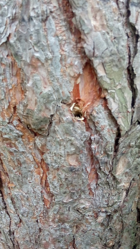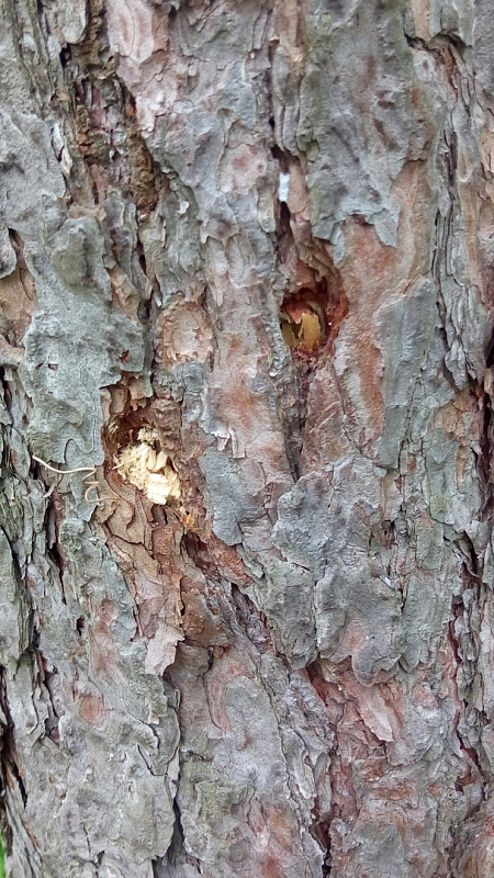 Похоже, это, действительно, вредительство со стороны непознанных лиц. Сверлили ночью, идти в темноте вглубь леса не решились. Причем сверлили в несколько этапов, это видно по дыркам. Зачем сверлили? Пока непонятно».