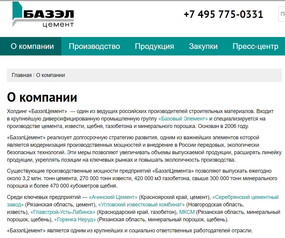 - Производственные мощности «Базэлцемента» описывались на сайте компании как 3,2 млн тонн в год, компания называлась одним из ведущих производителей стройматериалов в России. В группу входили несколько предприятий, включая «Ачинский цемент» в Красноярском крае, «Угловский известковый комбинат» в Новгородской области, «Главстрой-Усть-Лабинск» в Краснодарском крае, «Серебрянский цементный завод» в Рязанской области и др.