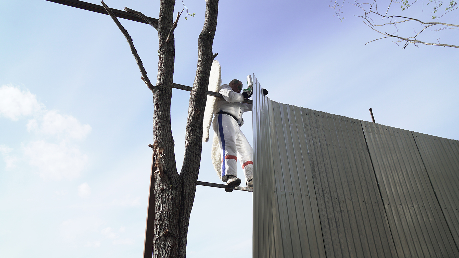 Пока полицейский и активисты выясняли, кому принадлежит забор и чей заказ выполняет полиция, Древарх Просветленный залез на ограждение и с криком «Это мой забор!» начал откручивать очередной стальной лист.