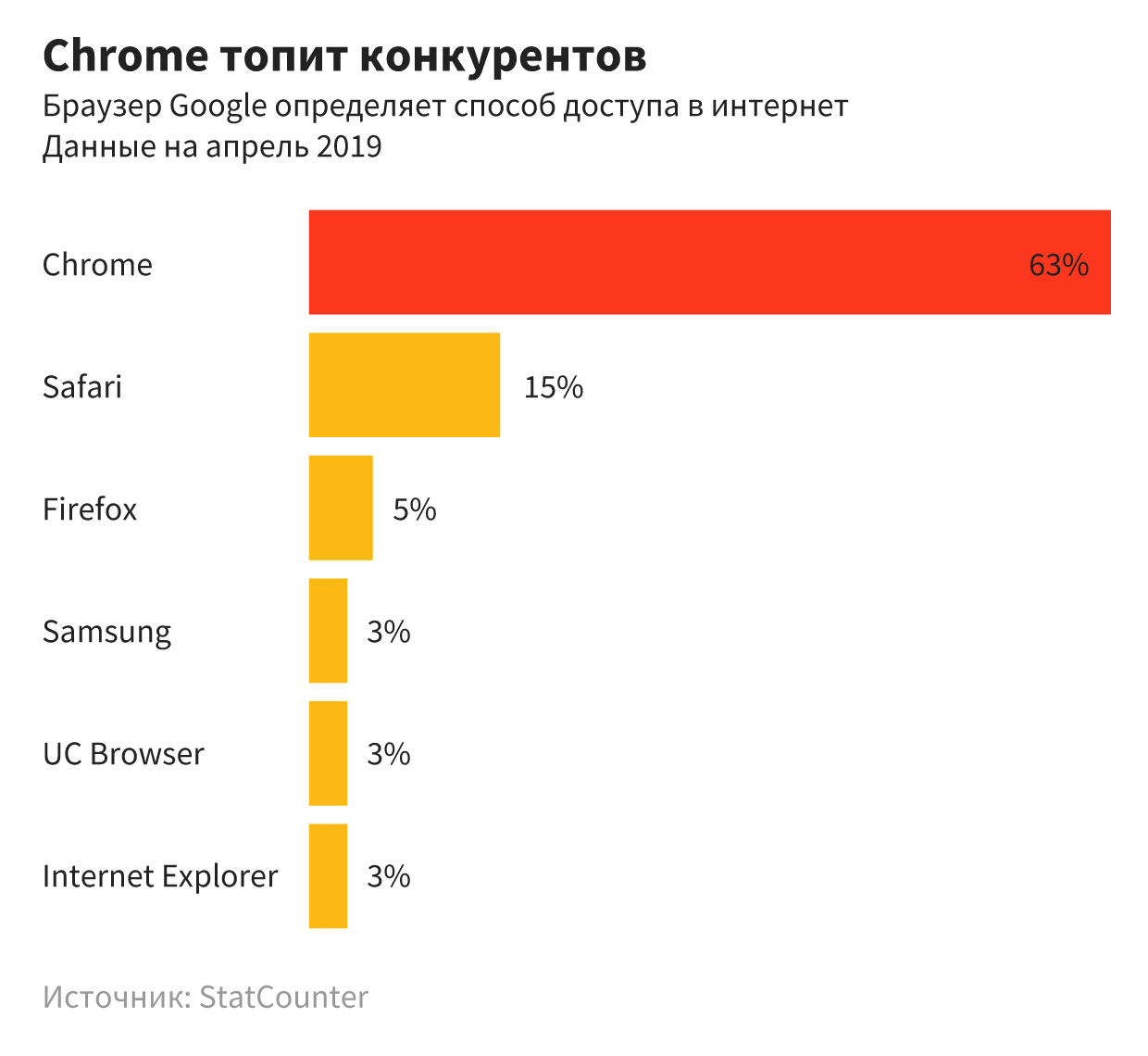 • Сейчас Chrome, запущенный в 2008 году, захватил 63% всего рынка (и 70% на настольных системах).