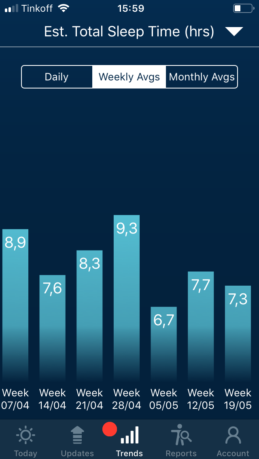 На этом графике наглядно видно, что я смог заставить себя спать больше в середине апреля, а потом всё немного испортил