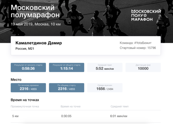 Судя по статистике Московского полумарафона, я пробежал даже быстрее среднего времени, а темп составил 5 минут 52 секунды на километр. Я не считаю это каким-то невероятным достижением, а многие и вовсе назовут мой результат посредственным. Но для меня это настоящая победа над самим собой: в начале года я бегал максимум 5 километров, поэтому вообще не думал, что такое время для меня реально.