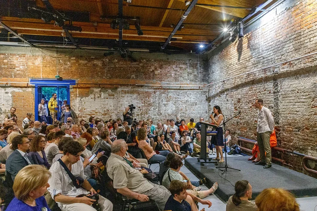 Внутри — полный зал. Все стулья заняты, люди толпятся вдоль стен, в предбаннике, сидят на трубах отопления, на полу, глядят и слушают с улицы через решетку в стене. У одного мужчины красными буквами на черной майке написано: «Люди, не убивайте друг друга». Это слова с памятного камня, установленного Дмитриевым в Сандармохе, — месте расстрела не менее 7,5 тысячи человек, которое в 1997 года нашла его экспедиция.