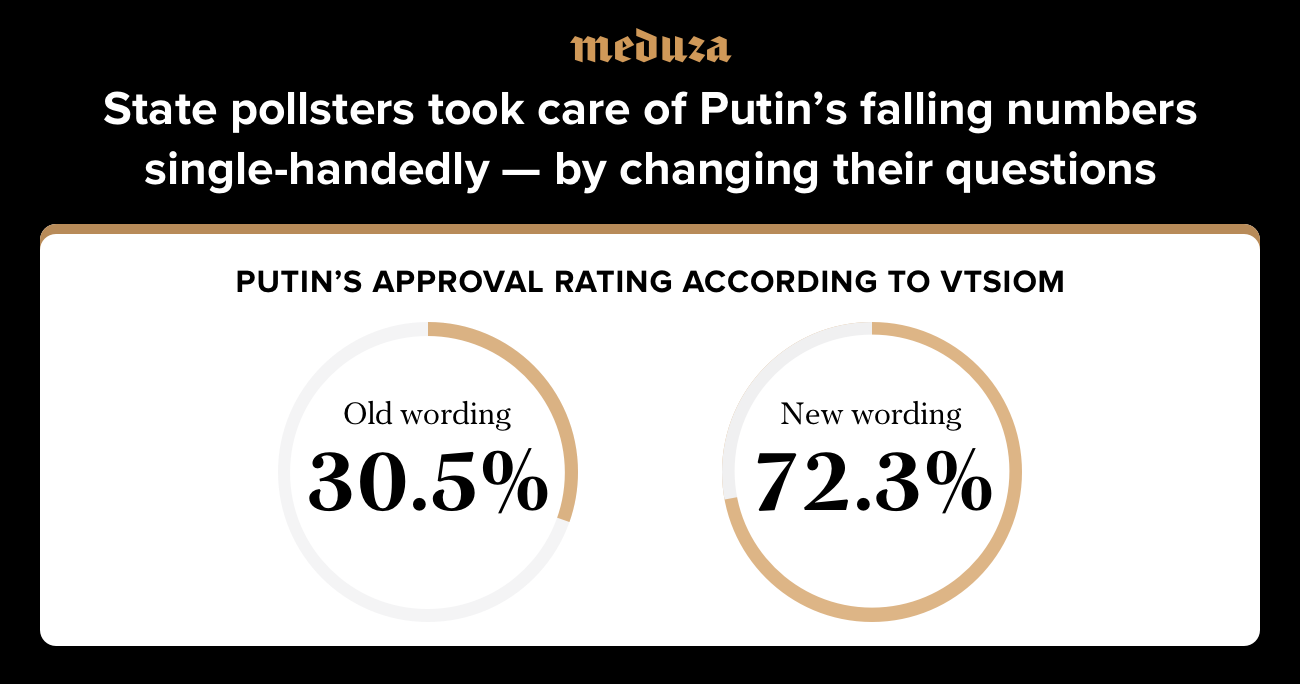 Valery Fyodorov, who leads the state-owned polling agency VTsIOM, promised to publish the results of a different survey that includes the close-ended question “Do you trust Vladimir Putin?” where previous surveys had asked an open-ended one: “Which of the following politicians do you trust?”