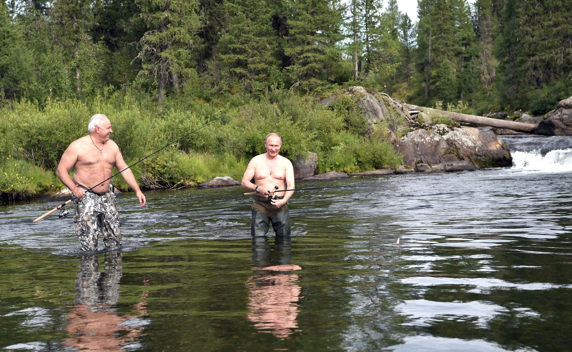 kremlin.ru Глава Хакасии в 2009–2018 годах Виктор Зимин и президент России Владимир Путин на рыбалке в Туве. Август 2017 года