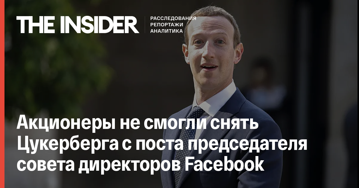 Несколько акционеров Facebook не смогли снять основателя социальной сети Марка Цукерберга с поста председателя совета директоров компании. Как сообщает CNBC, их предложение было отвергнуто большинством голосов.