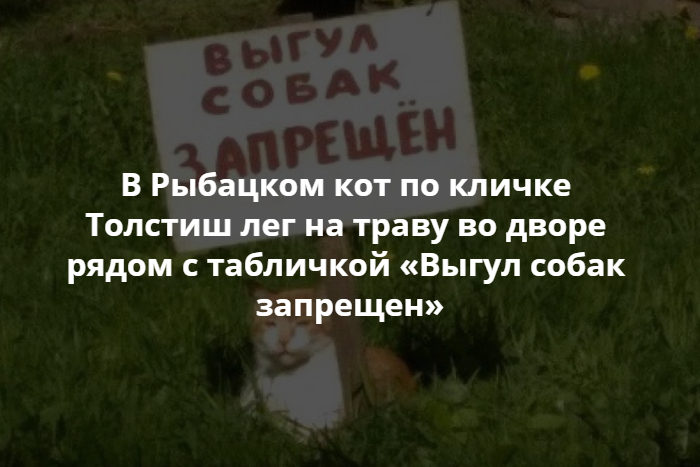 В Рыбацком кот по кличке Толстиш лег на траву во дворе рядом с табличкой «Выгул собак запрещен». Фотографию сделала петербурженка Ирина Фергюсон, а затем в инстаграме опубликовало издание «Медуза».