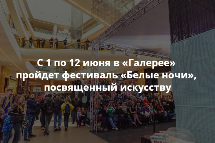 С 1 по 12 июня в «Галерее» пройдет фестиваль искусств «Белые ночи». Его организуют уже четвертый год подряд, сообщается на сайте ТРЦ.