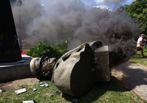 У Дворца спорта произошли стычки, как минимум один человек пострадал. После того как на месте акции были усилены наряды полиции, активисты переместились к бюсту Жукова и снесли его.