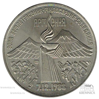 В 1989 году к первой годовщине Спитакского землетрясения Ленинградский монетный двор выпустил трехрублевую монету 3 млн. тиражом. Монеты 3 рубля 1989 года изготавливались из уже привычного медно-никелевого сплава и по размерам чуть превосходили советские юбилейные рубли: вес – 14,35 г, толщина - 2,3 мм и диаметр – 33 мм.