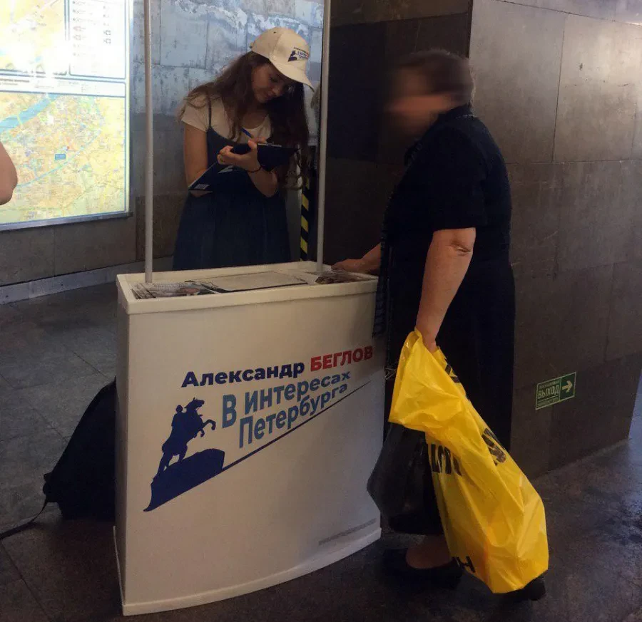 Администрации петербургского метрополитена известно, что в вестибюлях станций агитируют за Александра Беглова, сообщила «Новой» пресс-секретарь метро Юлия Шавель. Сборщики работают там «по договору» с метрополитеном, сообщила она, не уточнив, коммерческий это договор или безвозмездный.