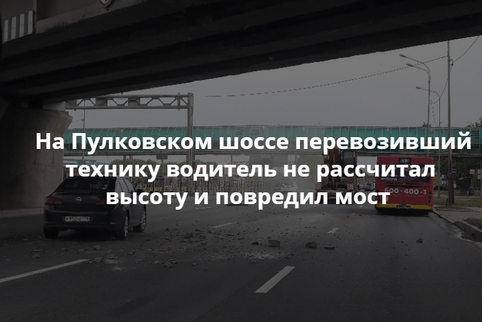 На Пулковском шоссе у развязки с КАД водитель грузовика, перевозивший строительную технику, повредил мост. Он не рассчитал общую высоту автомобиля и установленного на него оборудования, пишут очевидцы в социальных сетях.