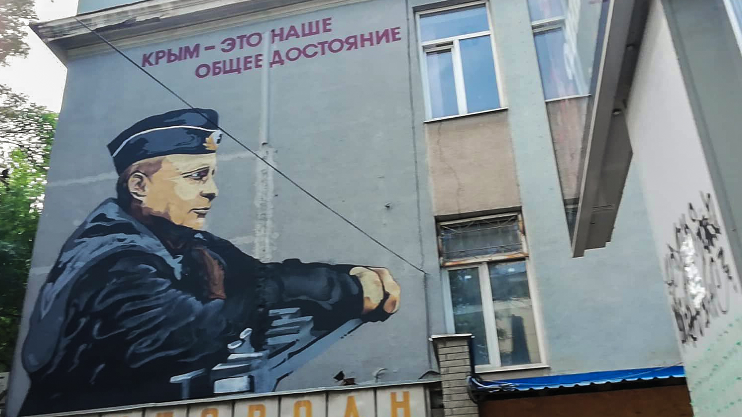Утром 21 мая в Симферополе на фасаде дома по улице Александра Невского, где находится мураль с изображением российского президента Владимира Путина, неизвестные нанесли трафаретную надпись с текстом: "ФСБ, давай поиграем? Е2 – Е4. Теперь твой ход, с***". Ответственность за акцию взяла на себя ранее неизвестная группа, которая называет себя "Телеграм-партия "Суверенный Крым", сообщает "Крым.Реалии".