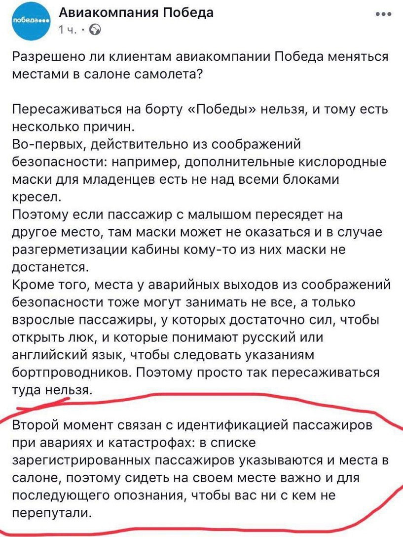 Тут авиакомпания «Победа» напомнила, что запрещает пассажирам меняться местами в самолете не из вредности (как вы могли подумать). А чтобы после авиакатастрофы их трупы легче опознавать было.