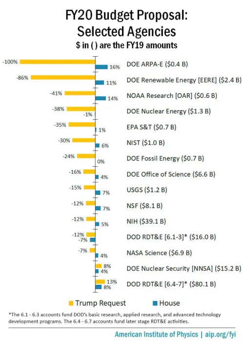 По разным статьям бюджетных расходов на науку предложения Трампа по изменению в сравнении с предыдущим годом показаны желтым, а встречные предложения Конгресса — синим. Для справки: расходы бюджета в 2019-м в абсолютных цифрах по каждой статье указаны в скобках.
