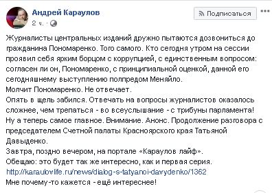 Ранее первый замгубернатора края Сергей Пономаренко на сессии Заксобрания заявил, что Караулов требовал 2,4 млн руб. за то, чтобы «передача, которая была заказана ему определенными всем известными политическими силами, не вышла в эфир». Как сообщает РБК, после этого Караулов собирается обратиться в Генпрокуратуру: