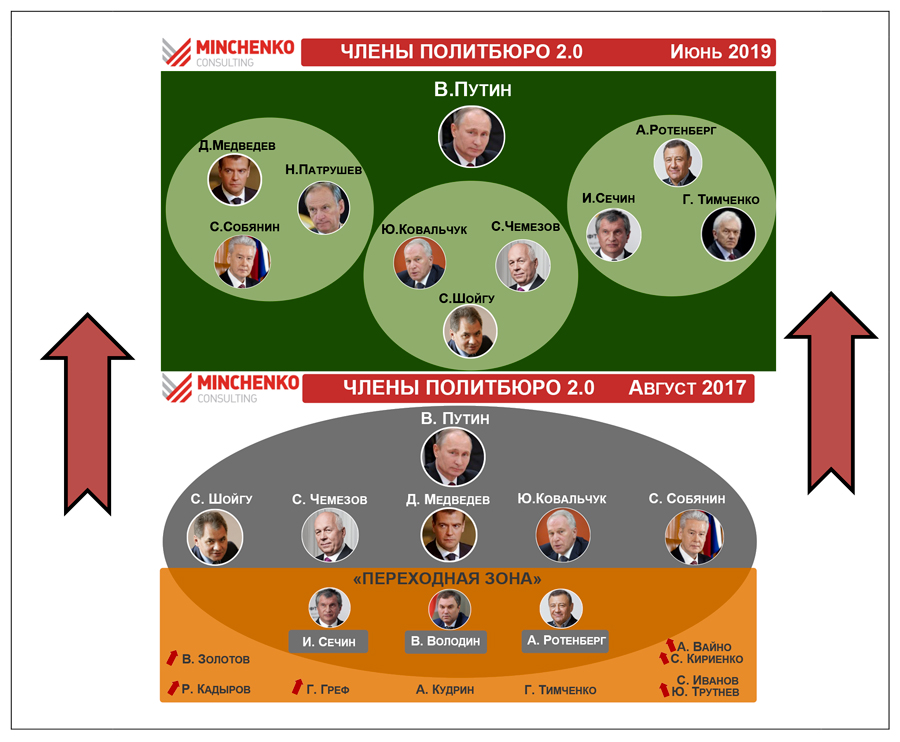 Семеро членов этого неформального объединения, кроме Тимченко и Патрушева, по мнению экспертов, находятся в этом властном ядре уже давно. Патрушев смог серьёзно укрепить свои позиции благодаря усилению Совета Безопасности, курирующего все российско-американские отношения. А Тимченко, старый знакомый Владимира Путина, в своё время уже входил в «Политбюро», но во второй половине 10-х годов оказался отодвинут от принятия серьёзных решений и вернул прежний статус только сейчас, говорится в документе. Зато своё место в «ближнем круге» утратил председатель Государственной Думы Вячеслав Володин.