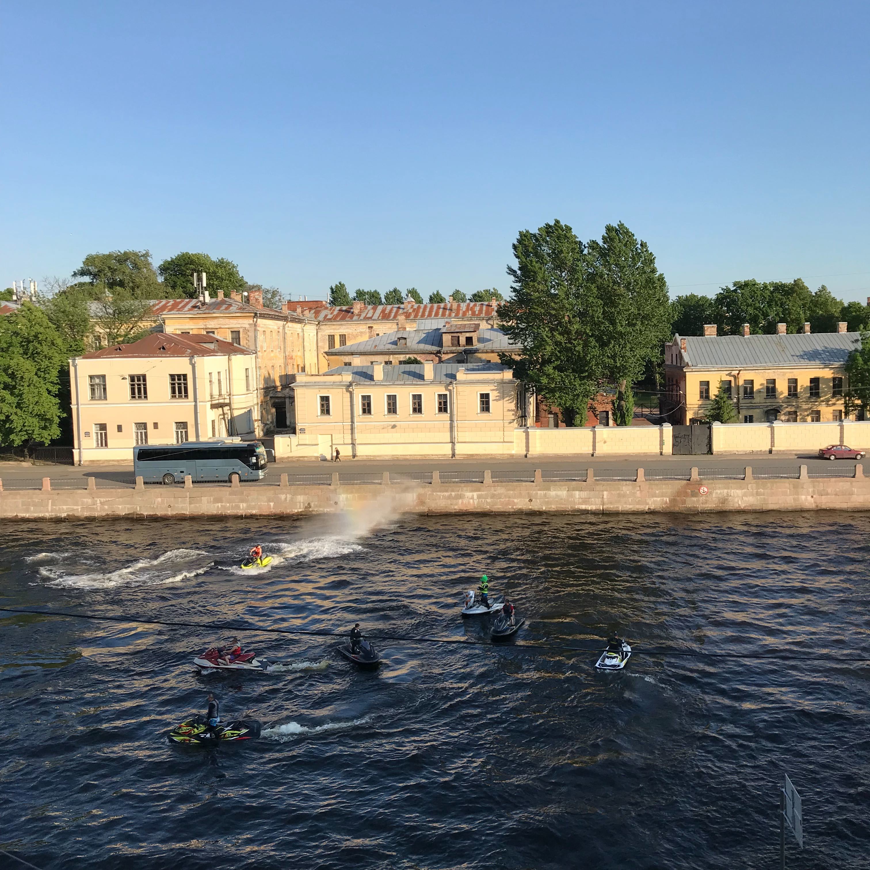 Петербуржцы катаются по рекам на гидроциклах — на Крюковом канале образовалась пробка на воде.