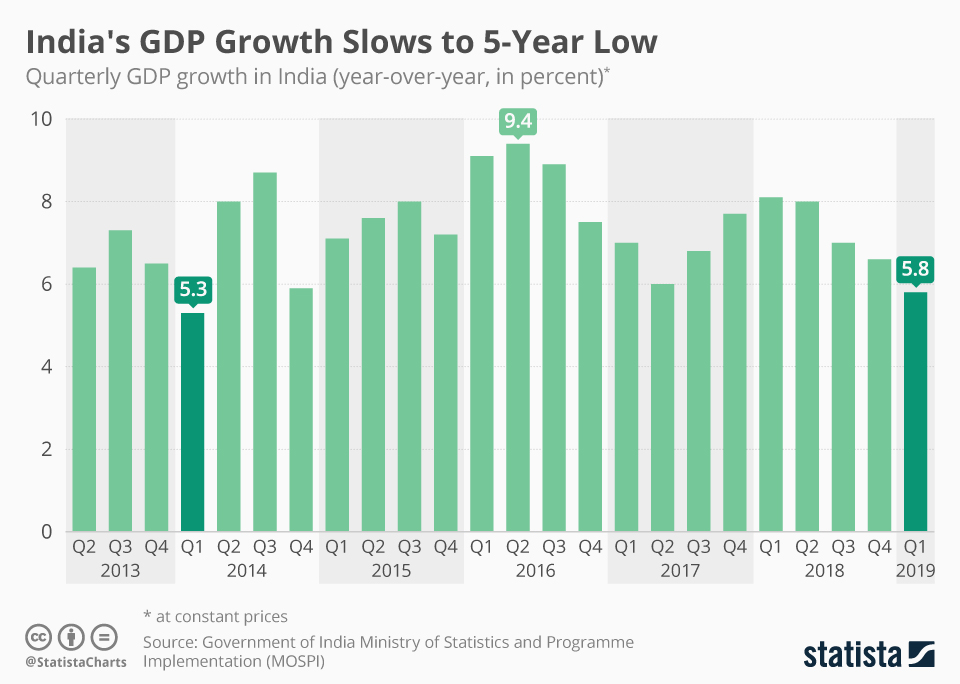 Итоги торговой войны Китая и США еще только предстоит подвести, но победу в другой битве КНР уже одержала — Индия уступила Китаю звание самой быстрорастущей экономики мира. В первом квартале 2019 года ее экономика выросла на 5,8%, это минимум за последние 5 лет. Китайская экономика за тот же промежуток выросла на 6,4%, что и вывело страну на первое место.