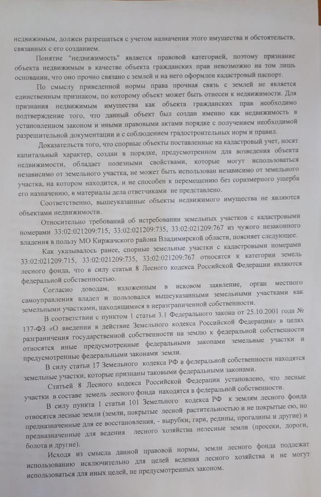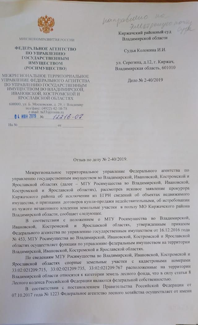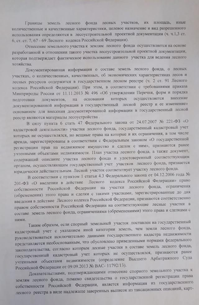 В ходе заседания был предъявлен отзыв Межтерриториального управления Росимущества, в котором федеральные чиновники объяснили, почему земли лесного фонда должны быть возвращены в собственность Российской Федерации, а не возвращены муниципалитету. Лес, если он находится на территории должен относиться к лесному фонду. Также земли, где ведется или планируется лесовосстановление, также должны принадлежать лесному фонду.