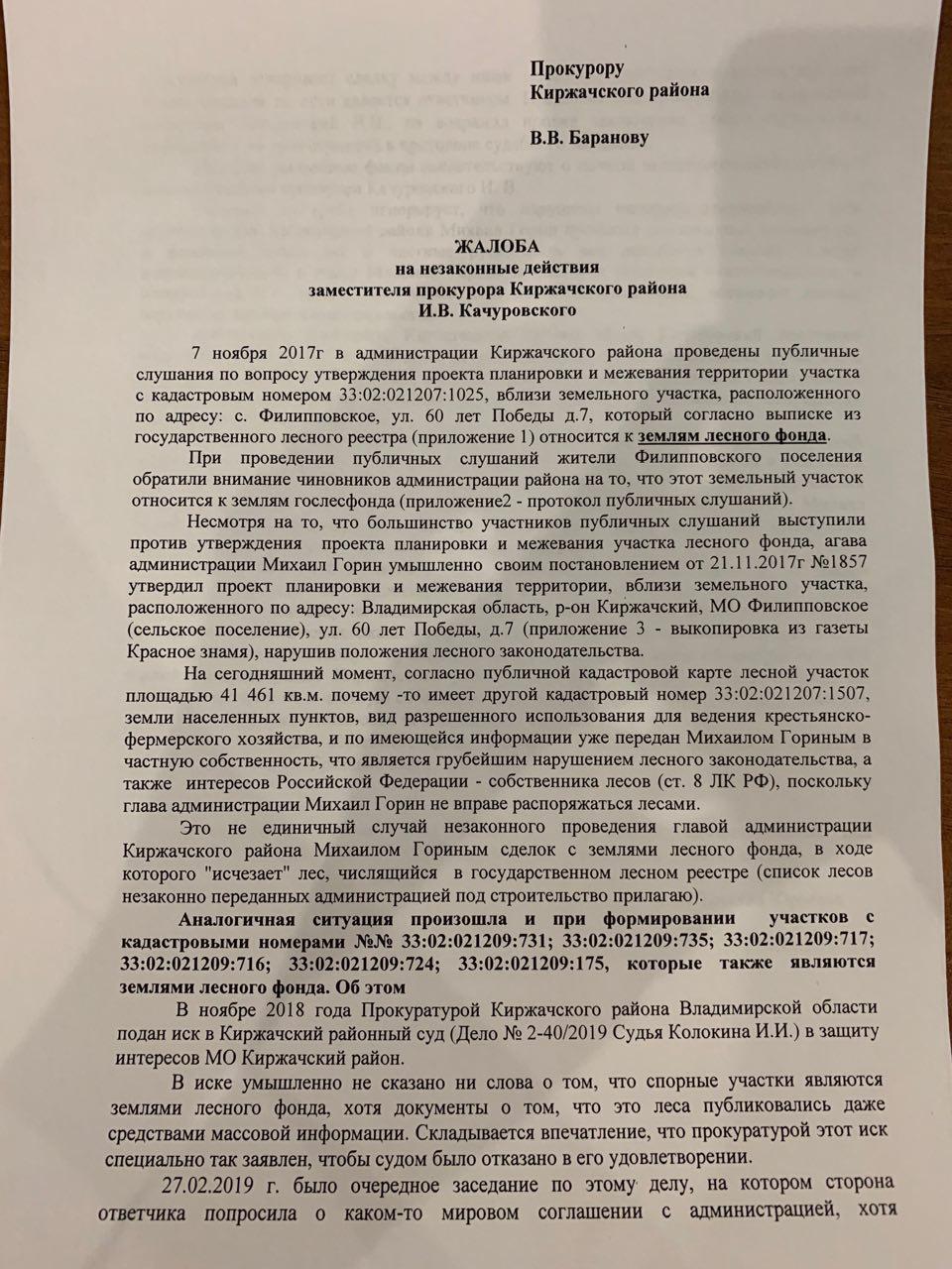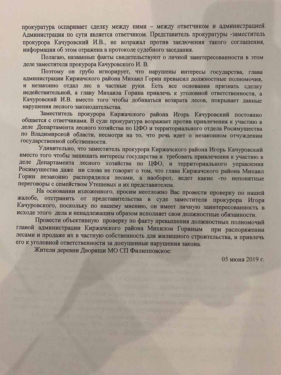 Жители деревни Дворищи подали жалобу на действия заместителя районного прокурора. По мнению киржачских экоактивистов, администрация района незаконно продает земли лесного фонда.