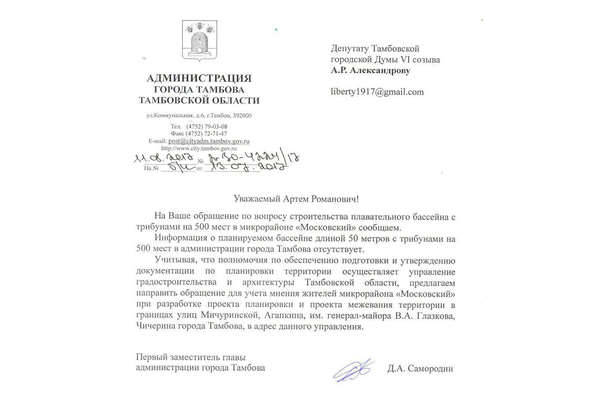 На севере Тамбова собирались построить самый крупный бассейн в регионе. Однако вместо этого на территории могут появиться многоэтажные дома. 4 июня неизвестные лица провели от имени местных жителей пикет за строительство многоэтажки и против бассейна. Сами местные жители говорят, что никогда раньше не видели этих людей.