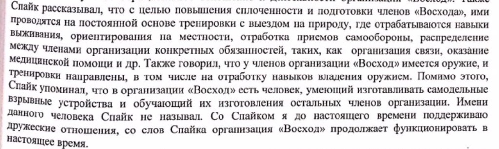 В конце 2014-го, говорится в протоколе, Шакурский попросил его поучаствовать в написании текста для придуманной им организации, «целью которой является <…> продвижение идей анархизма в России». Он помог. После этого Шакурский стал рассказывать приятелю, что создал организацию «Восход», которая ставит своей целью «внесение дестабилизации в существующее государственное устройство путем совершения массовых беспорядков, вооруженных нападений на госслужащих и сотрудников правоохранительных органов, поджогов, взрывов».