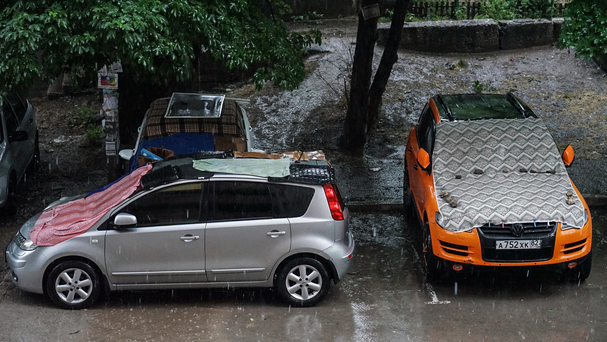 Во дворах и на стоянках автолюбители, опасаясь града, накрывали свои машины покрывалами и одеялами.