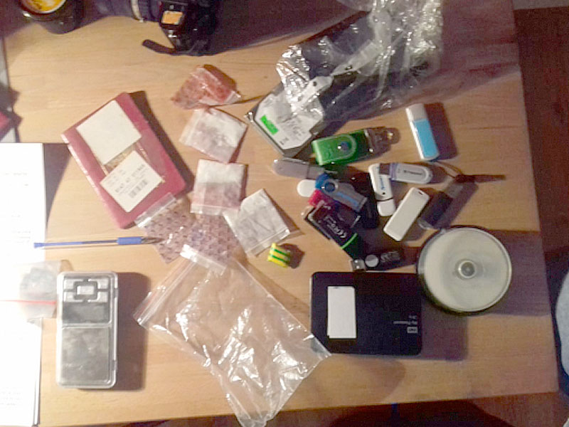 Этот релиз сопровождается фотографиями пакетов с белым порошком, лабораторной посуды и бутылок с химреактивами. При этом подлинность фотографий массово оспаривают. Корреспондент «Би-би-си» Илья Барабанов утверждает, что лишь одна из девяти опубликованных фотографий сделана в квартире Голунова, на ней изображен загранпаспорт журналиста. Редактор отдела расследований «Медузы» Алексей Ковалев заметил, что на записках, попавших на фотографии — «не Ванин почерк». При этом в МВД настаивают на подлинности съемки: «Фотографии, размещенные на официальном сайте, сделаны при обследовании жилища подозреваемого, в арендуемой квартире на Вешняковской улице Москвы и при его личном досмотре, проведенном в присутствии понятых», — цитирует агентство «Москва» слова своего источника.