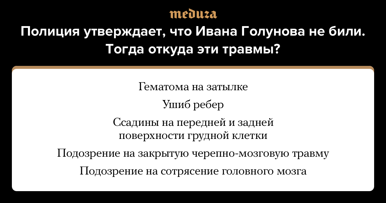 Утром 8 июня Ивану Голунову стало плохо в полиции. Врачи скорой помощи предварительно диагностировали у него подозрение на сотрясение мозга, на перелом двух ребер, множественные ушибы и гематомы, сообщил адвокат журналиста Дмитрий Джулай. The Bell сообщил со ссылкой на заключение скорой помощи, что у Голунова подозрение на закрытую черепно-мозговую травму. Всего к Голунову вызывали три бригады скорой помощи, но одну из них к нему не пустили. Две других потребовали, чтобы его госпитализировали, несмотря на давление полицейских. После этого журналиста увезли в 71-ю городскую больницу на обследование. Адвокатов в кабинеты, где врачи проводили осмотр, не пускали; по мнению Джулая, на врачей могли оказывать давление.