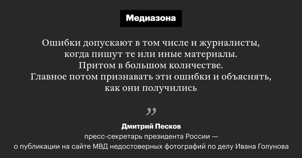 «Ошибка возможна. Ошибки допускают в том числе и журналисты» — Песков о недостоверных фотографиях МВД по делу Ивана Голунова