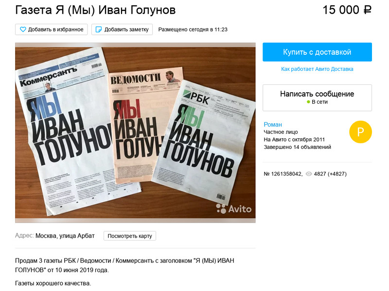 Газеты с передовицами об Иване Голунове раскупили в Москве за считаные часы и продают на Avito за 15 тысяч рублей