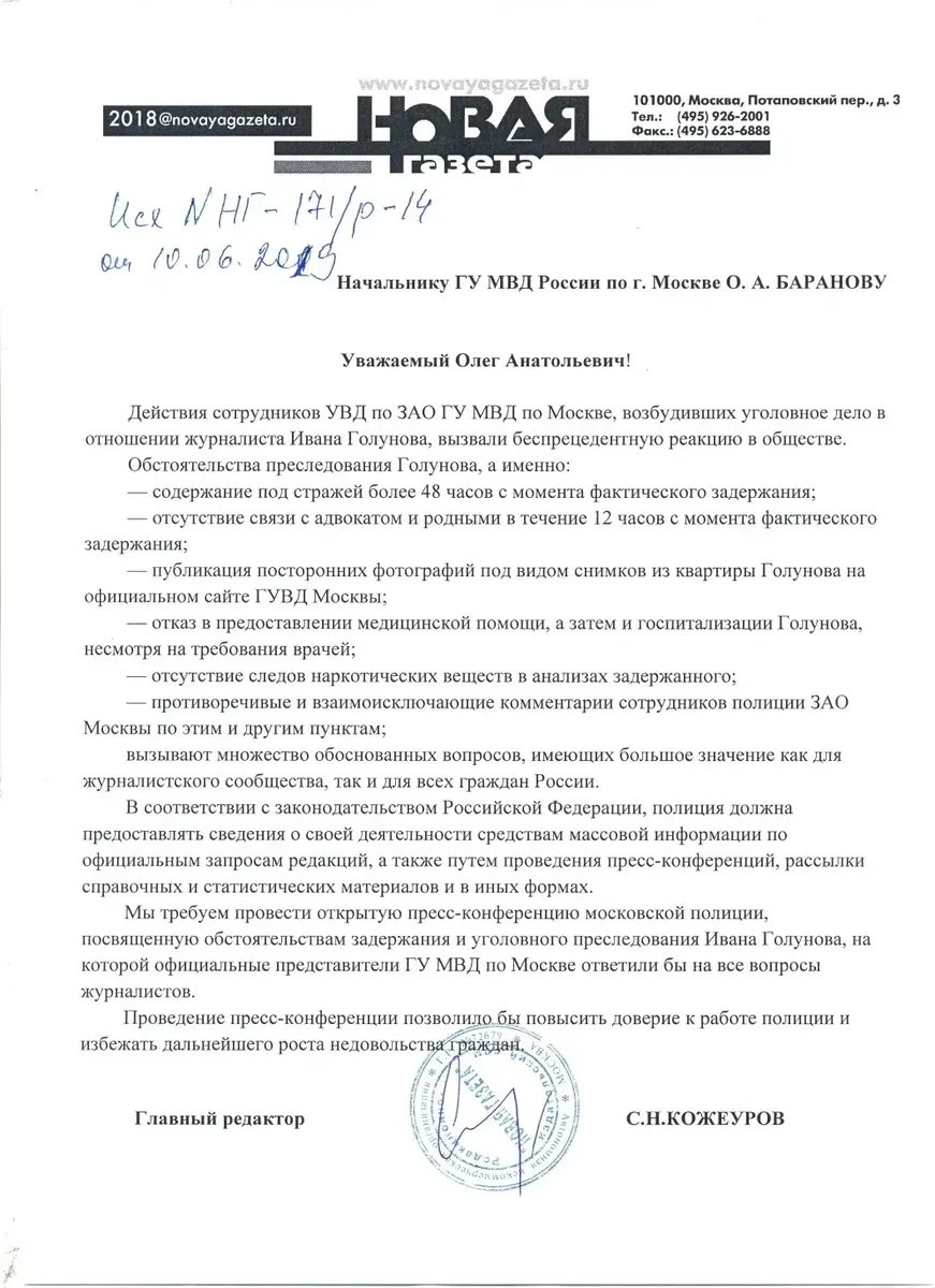 Редакция «Новой газеты» отправила в ГУ МВД России по Москве официальный запрос с требованием провести открытую пресс-конференцию по делу Ивана Голунова, на которой представители полиции ответили бы на все вопросы об обстоятельствах задержания и уголовного преследования журналиста.