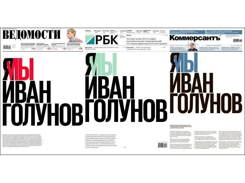 Сегодня на передовицах крупнейших деловых газет страны, «Коммерсанта», «Ведомостей» и РБК одинаковый коллаж — «Я / Мы Иван Голунов». Три издания сделали совместное заявление, в котором, помимо прочего, требуют детальной проверки действий сотрудников МВД, причастных к задержанию журналиста.