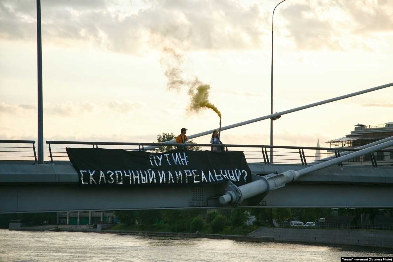 7 июня активисты "Весны" вывесили на Лазаревском мосту баннер с надписью: "Путин сказочный или реальный?".