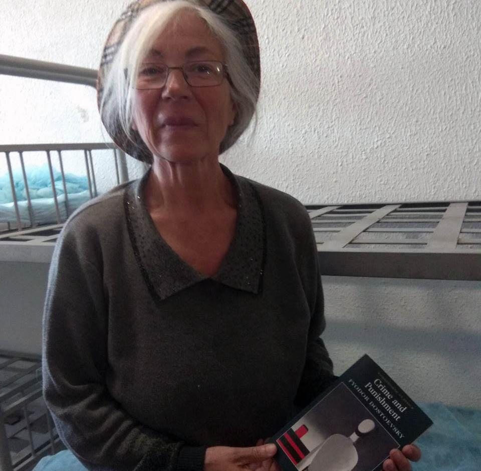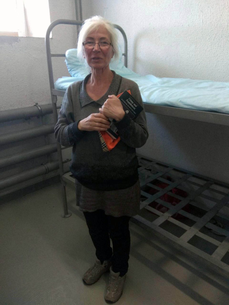 «Я чувствую себя здесь хорошо, — говорит она. — Я понимаю, что совершила нарушение и эти люди должны меня наказать как в книге, — она показывает на томик Достоевского. — Но они добры ко мне».