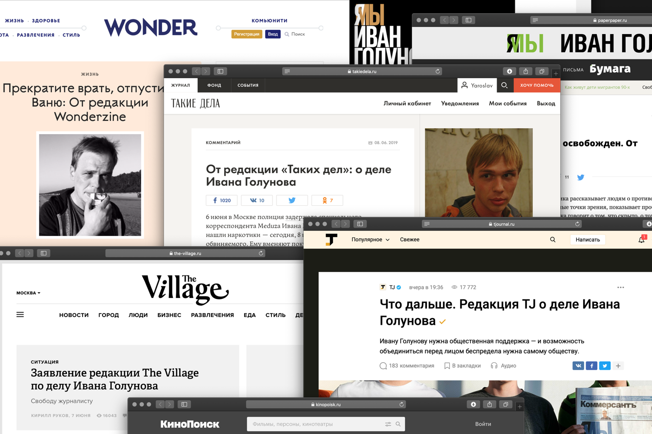 Несколько дней в Москве шли одиночные пикеты в поддержку Ивана Голунова. Видеообращения с требованиями справедливого суда записывали десятки знаменитостей. СМИ по всей России (и за ее пределами) высказывались в пользу журналиста «Медузы» — коллеги от Владивостока до Калининграда рассказывали читателям о деле Ивана, публиковали его тексты и требовали от властей справедливого разбирательства. Голунова поддерживали не только общественно-политические издания: о нем писали сайты о музыке и кино, религиозные порталы и глянец. «Медуза» публикует вторую часть обращений СМИ в поддержку Ивана Голунова (первую можно прочитать здесь).