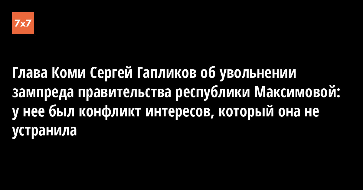 Глава Республики Коми Сергей Гапликов 11 июня на медиафоруме региональных СМИ «Местные» прокомментировал увольнение заместителя председателя правительства Коми Ларисы Максимовой. Он сказал, что о конфликте интересов у Максимовой было известно, но она не стала его устранять, сообщил находящийся на медиафоруме корреспондент «7x7».