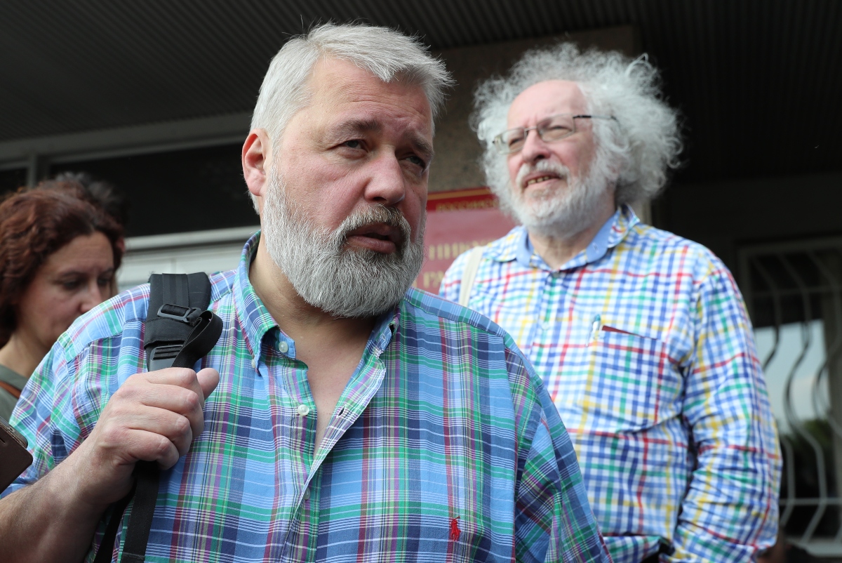 Дмитрий Муратов (слева) и Алексей Венедиктов у Никулинского суда Москвы, 8 июня. Фото: Сергей Савостьянов/ТАСС
