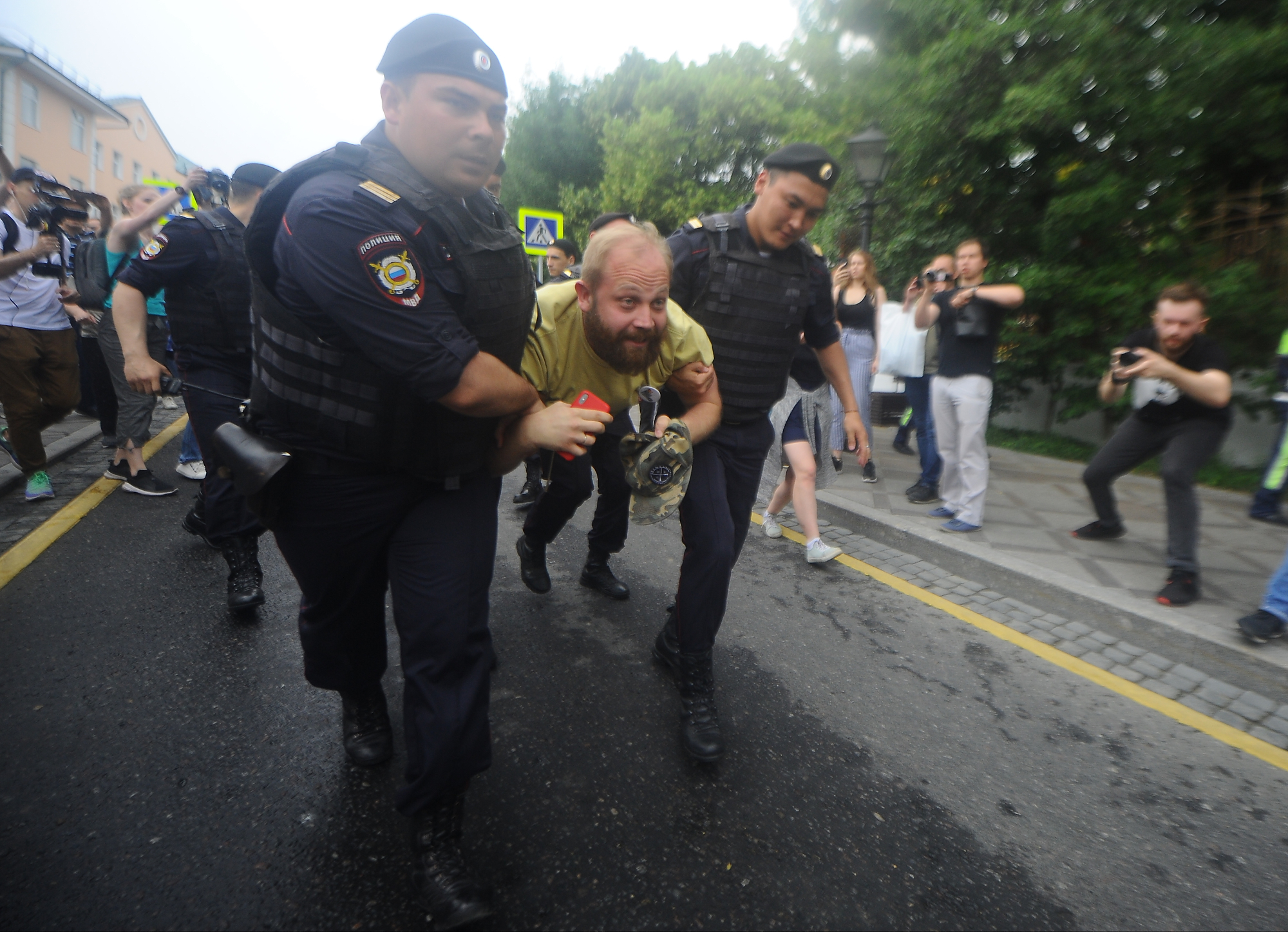 Во время разгона акции полиция применяла силу, резиновые дубинки и поливальные машины. Троим задержанным понадобилась медицинская помощь. На одного из участников акции составили протокол за то, что он выкрикивал имя: "Иван Голунов". Полицейские назвали это антиправительственным лозунгом.