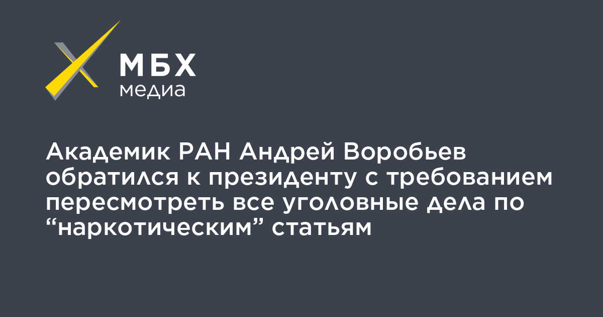 Академик РАН Андрей Воробьев обратился к президенту Владимиру Путину с требованием пересмотреть все уголовные дела по статьям 228, 228.1 и 229 УК. Воробьев направил на имя президента соответствующее письмо, копию он предоставил обозревателю «МБХ медиа» Зое Световой.