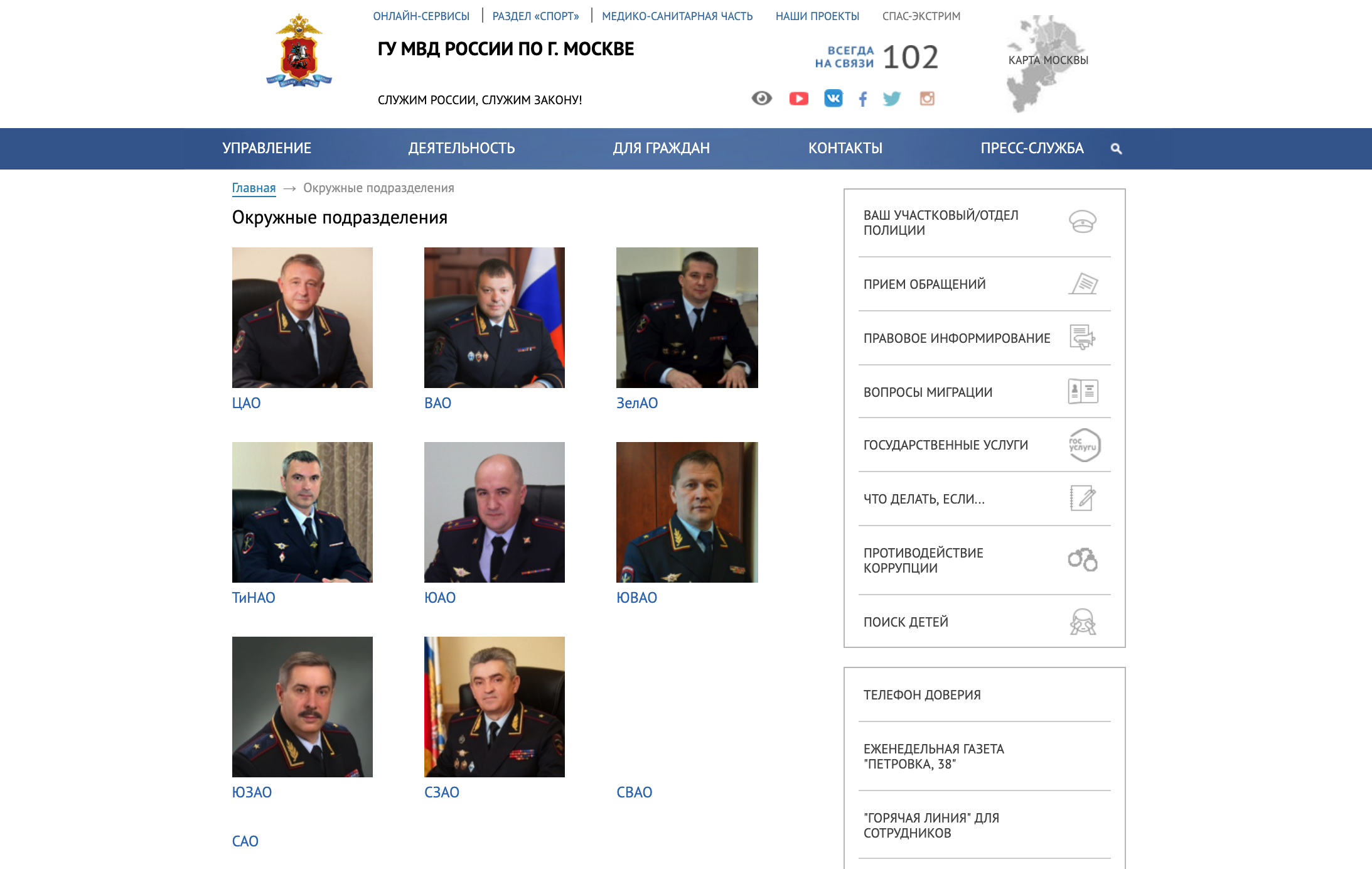 В разделе «Окружные подразделения» на сайте управления МВД по Москве пропала информация об УВД по ЗАО. Внимание на это обратил телеграм-канал «Голунов», который сотрудники «Медузы» создали после задержания журналиста Ивана Голунова.